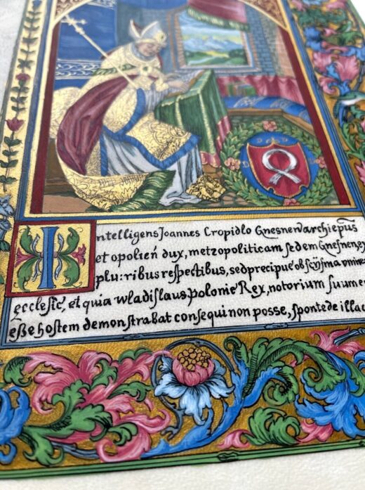 This miniature is hand painted high quality reproduction of illuminated manuscript leaf of Catalogus archiepiscoporum gnesnensium by Jan Długosz